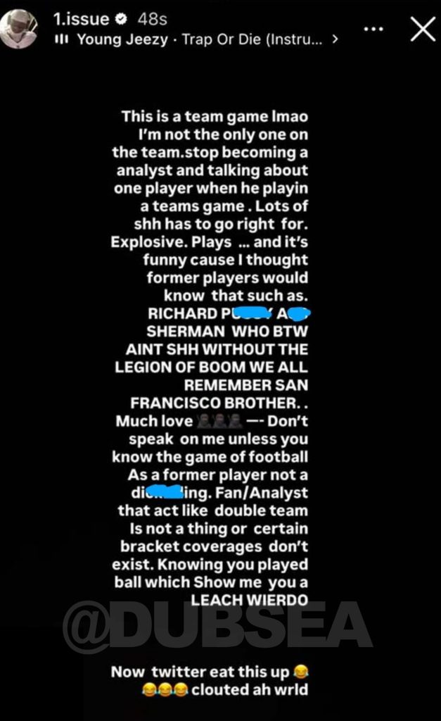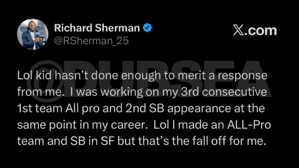 Sherman’s critique did not sit well with Pickens. The young receiver responded on his Instagram Story with a fiery message aimed directly at Sherman before deleting the post. In his now-removed post, Pickens called Sherman a “p—-y ass” and suggested the former cornerback’s reputation was tied too heavily to the Seattle Seahawks’ legendary Legion of Boom defense, implying that Sherman’s legacy was inflated. Pickens also used other insults to dismiss Sherman’s analysis and argued that NFL analysts should not single out one player when football is a team sport.